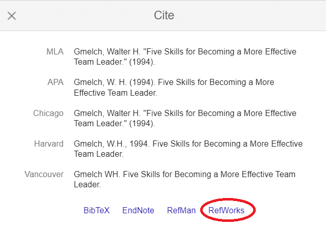After clicking on "cite," four options will appear (Bibtex, EndNote, Refman, RefWorks). Click on RefWorks.